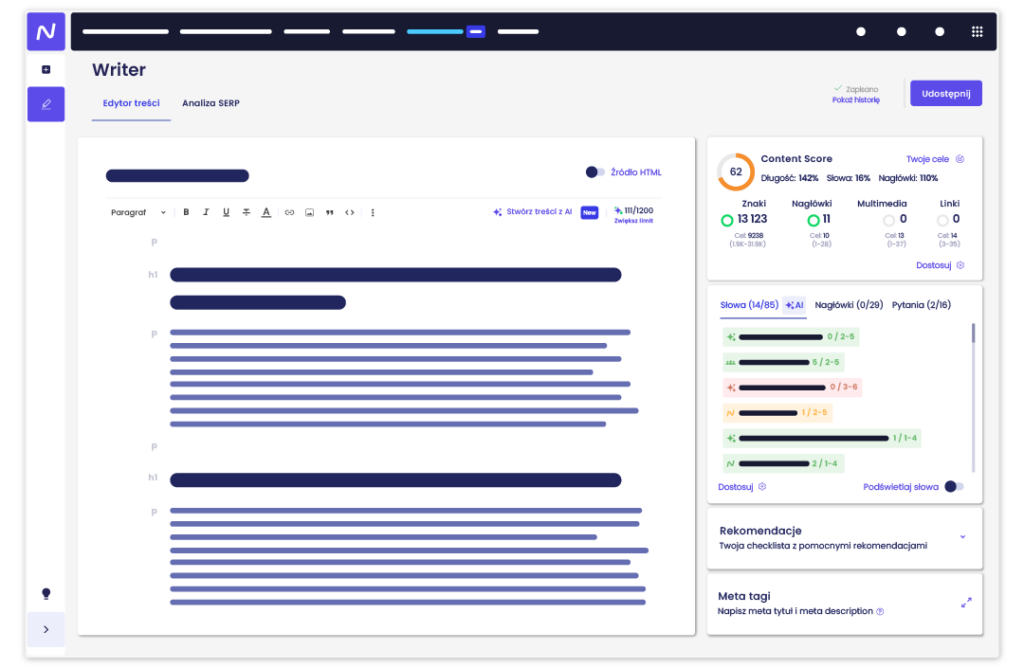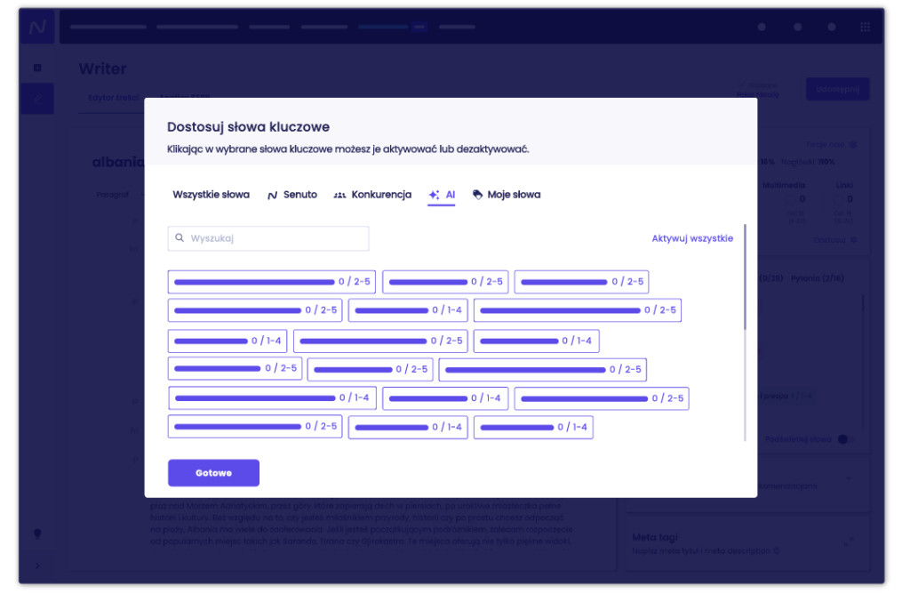 Jednym z praktycznych elementów Senuto Writer jest wsparcie przy tworzeniu: